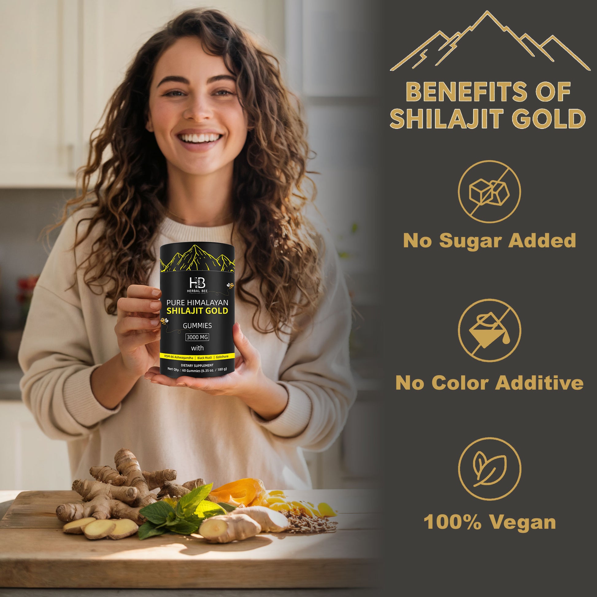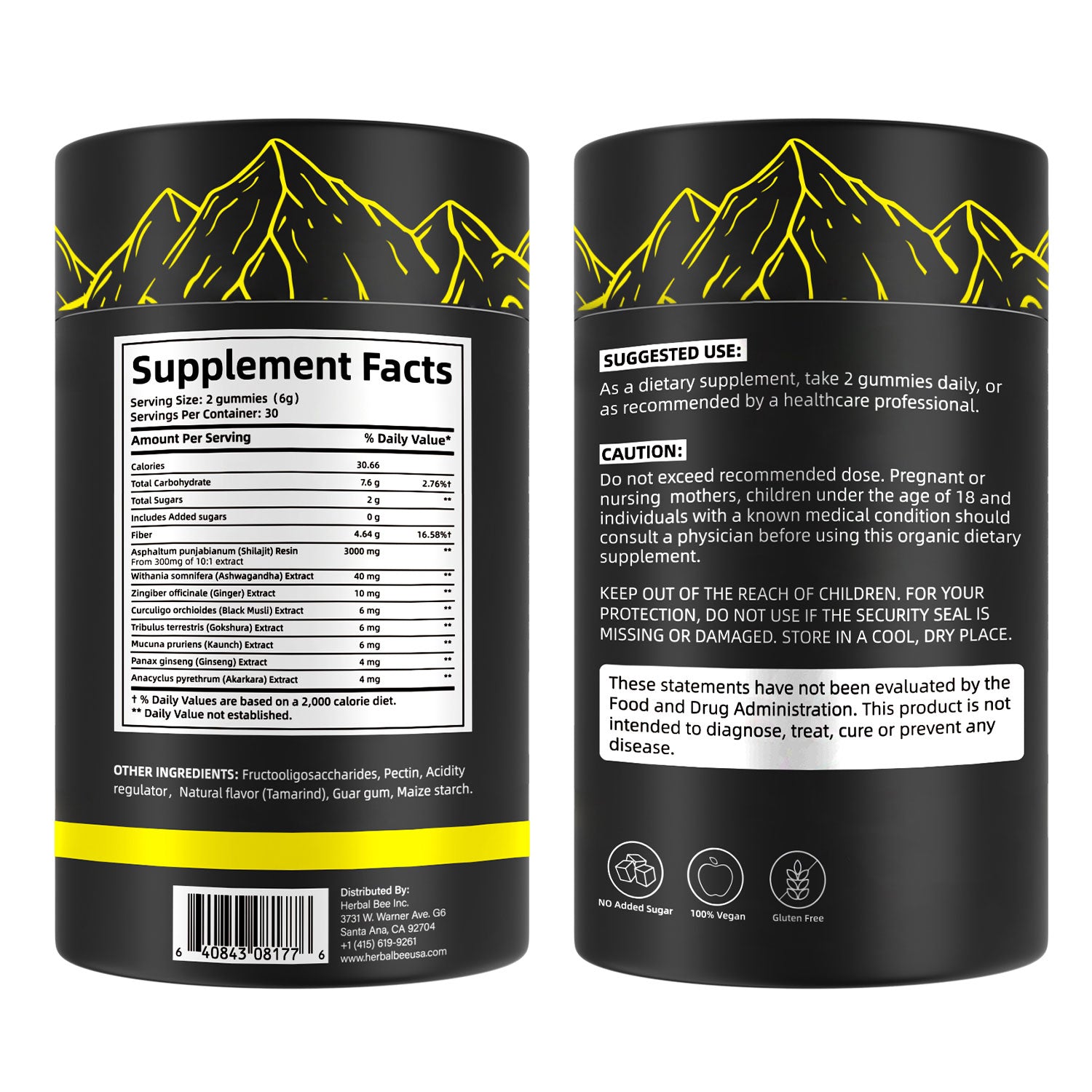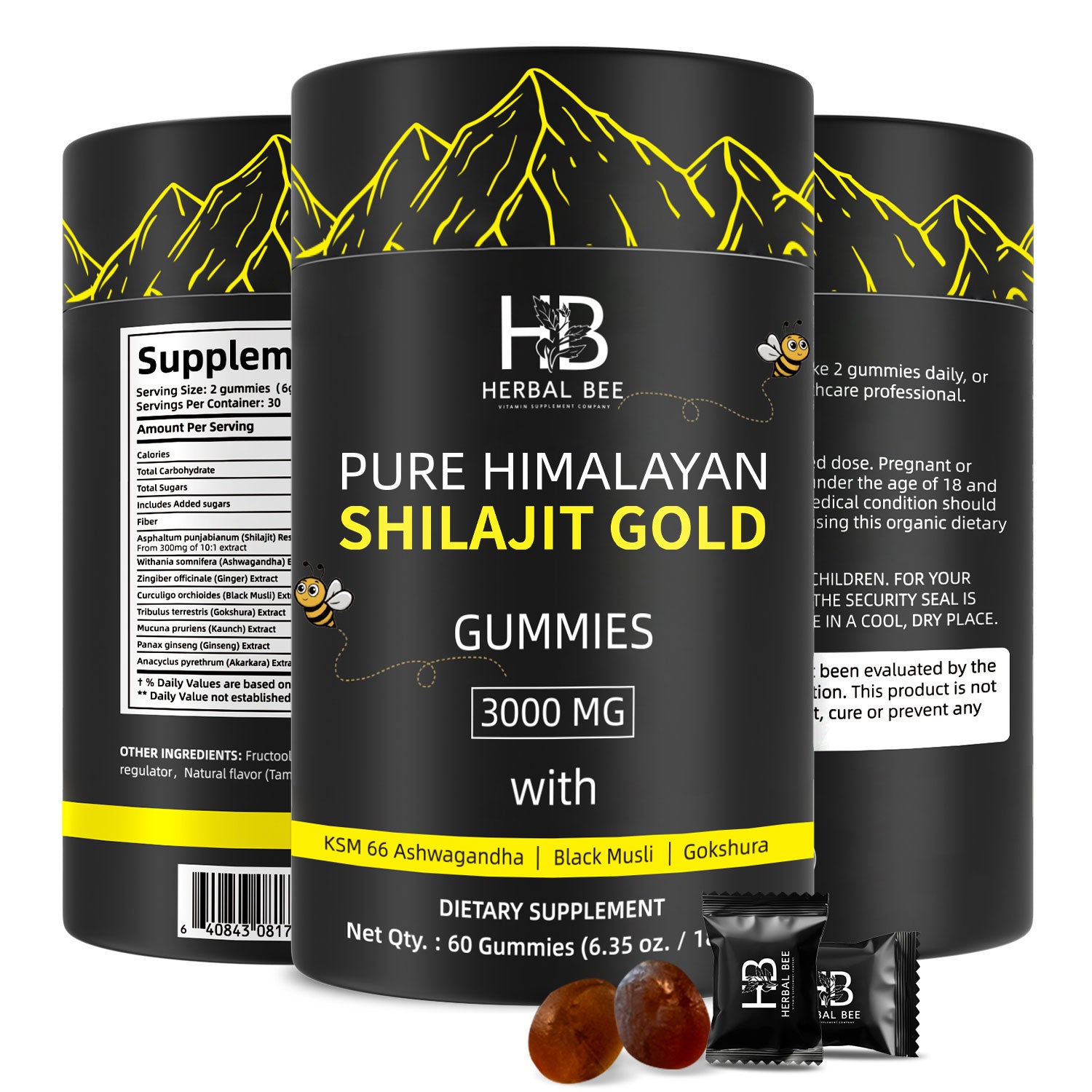 - NATURE'S PURE ENERGY SOURCE: Herbal Bee Shilajit gummies will give you the boost you need with its 3,000mg of pure Shilajit and unique ingredients such as Ashwagandha, Aloe Vera, Black Fungus, and Gokuraku Dew, Our Shilajit Gold Gummy packs deliver 100% essential nutrients in a purely natural and organic form that you need.